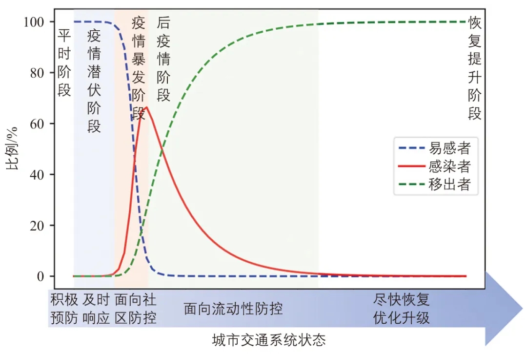 5)恢復提升階段,此階段疫情已得到控制,但難以確定是否還具有無癥狀感染者,所以需繼續(xù)保持警惕,防止疫情反彈。同時城市內(nèi)居民出行及日;顒訉⑷婊謴停瑥椥孕枨箢l次等將全面增加。要繼續(xù)重視客流密度控制,繼續(xù)確保應急物資運輸通道的通暢,并及時依據(jù)現(xiàn)有問題優(yōu)化升級交通系統(tǒng),提升城市免疫力。