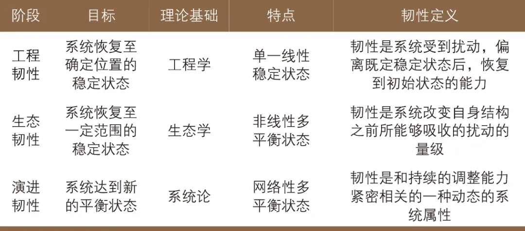 大衛(wèi)·亞歷山大(David Alexander)從語源學角度分析出韌性(Resilience)一詞最早來源于拉丁語“resilio”,其本意為恢復到原始狀態(tài)[7]。1973年文獻[8]首次將韌性理念應用到生態(tài)學中,提出生態(tài)系統(tǒng)韌性,此后韌性的內(nèi)涵及應用持續(xù)豐富。2009年聯(lián)合國國際減災戰(zhàn)略署(United Nations International Strategy for Disaster Reduction, UNISDR)提出“韌性是系統(tǒng)、社區(qū)或社會在受到干擾時,能夠及時通過有效的方式抵抗、吸收,適應外部變化,并從其影響中恢復的能力”[9]。韌性通過工程韌性(Engineering Resilience)、生態(tài)韌性(Ecological Resilience)、演進韌性(Evolutionary Resilience)的發(fā)展演變后,已從簡單追求單一線性穩(wěn)定狀態(tài)轉(zhuǎn)變?yōu)閺娬{(diào)持續(xù)適應的網(wǎng)絡性多平衡狀態(tài)(見下表)。