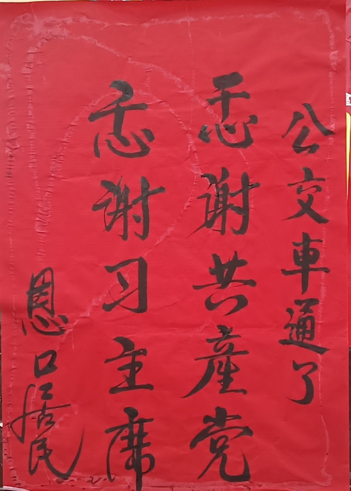 “公交車通了,感謝共產(chǎn)黨,感謝習(xí)主席”10月11日,一張鮮艷的大紅紙張貼在恩口車站門口,感謝語下面的落款為恩口居民。自10月9日恩口線路公交車試運(yùn)營以來,交通環(huán)境的改善就不斷地收到當(dāng)?shù)鼐用竦?/span>稱贊。
